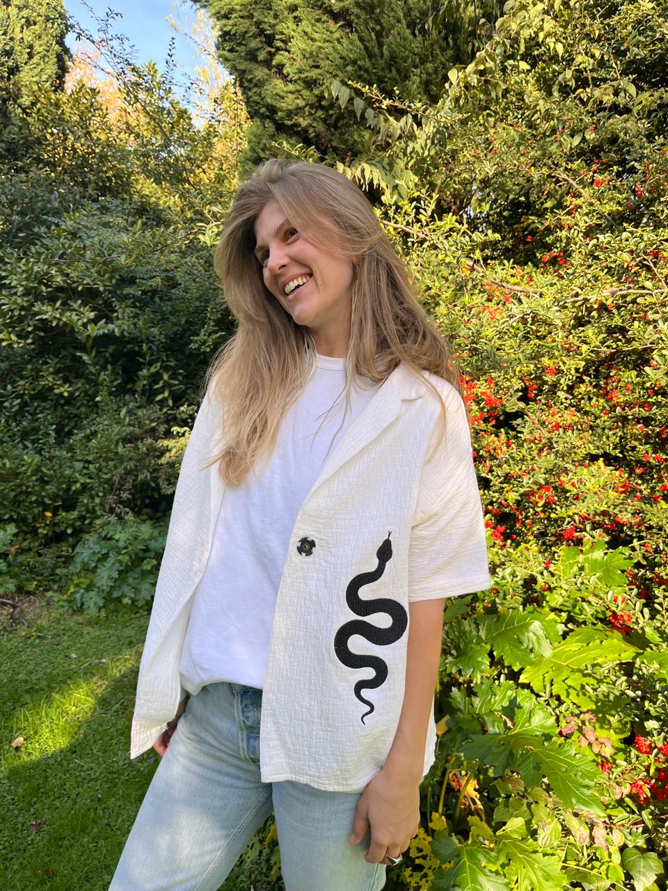 En algodón Terry orgánico, con botones frontales y bordado de serpiente para invocar tu transformación.